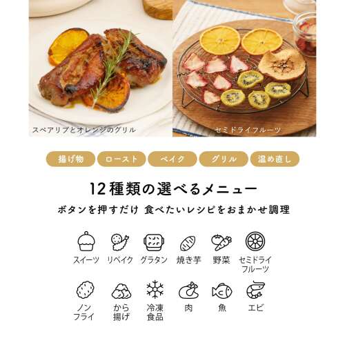熱風で食材を360°包み込む「全方位ヒートフロー製法※1」で、147.2kcalカロリーオフ※2。いつもの唐揚げが、油なしでもクリスピー&ジューシーな味わいに!12種の選べるメニューを搭載し、初めてでも簡単に調理が可能です。