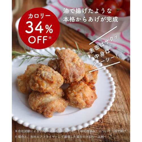 ※2自社試験による。165gの鶏もも肉(皮付き、下味処理済み)について、油で揚げた場合と当社エアフライヤーにて調理した場合のカロリー比較。