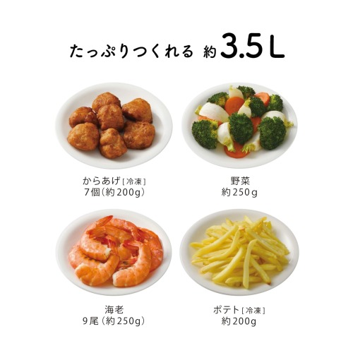 プリセットメニュー機能:12メニュー(ノンフライ/から揚げ/冷凍食品/肉/魚/エビ/野菜/焼き芋/グラタン/リベイク/スイーツ/セミドライフルーツ)材質 本体、本体土台: ポリプロピレン、ステンレス、シリコーンゴム