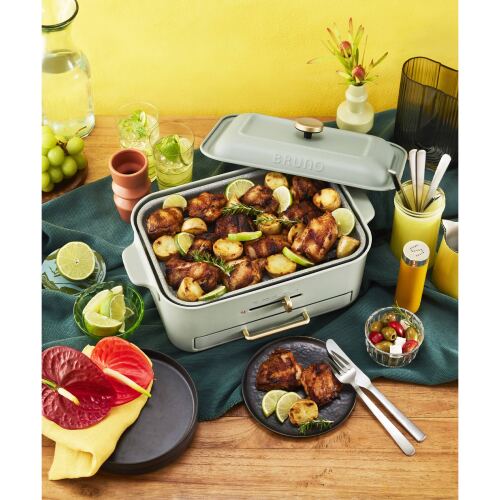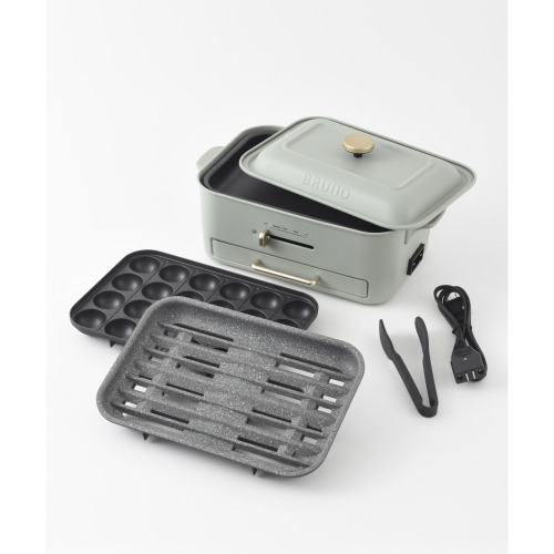焼肉やグリル料理で気になる油はねや煙・ニオイの悩みを解決した、コンパクトグリルホットプレートをBRUNOオリジナルの巾着に収めた、ギフトにぴったりのセットです。油はねでべたついたテーブルの拭き掃除など面倒な後片付けは、パパっと簡単に。室内に残るニオイも軽減されるため、いつでも気軽におうち焼肉が愉しめます。調理中に出る余分な脂は減煙プレート穴から下の水受けトレイへ落ちて、おいしくヘルシー。減煙プレートと平面、たこ焼きの3種の付属プレートのほか、コンパクトホットプレートのオプションアイテムもそのまま使えるため、幅広いお料理で活躍します。つくる人も食べる人も、みんなが“おいしい”ホットプレートです。