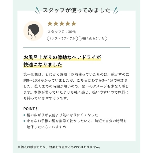 大風量と幅広口径で、忙しい朝のスタイリングもスムーズに仕上げます。