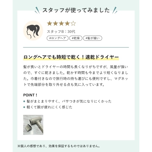 速く、やさしく 、美しく。いつものドライ時間がしなやかなツヤ髪をつくっていく、そんな 髪も心も弾むような毎日をお届けします。
