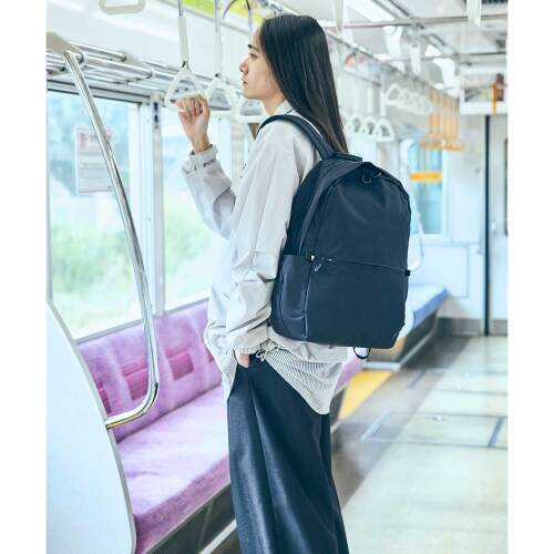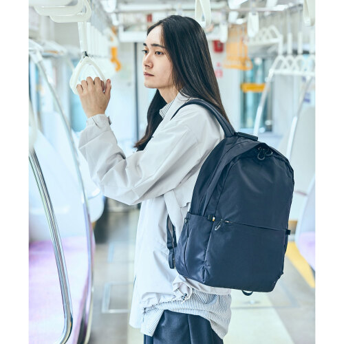 収納力・軽さ・耐水性に優れたミニマルデザインのバックパック。内装には15インチのノートPCが収納できるクッション付きスリーブポケットと2つの小物ポケットを搭載。外装にはすぐ取り出したい物の収納に便利なフロントポケット、ペットボトルや傘を収納できる両サイドのポケット、背負ったまま物を出し入れできる背面のファスナーポケットを搭載し、ミニマルなデザインとは裏腹に使い勝手を考え抜かれたポケットの配置が魅力です。背面にはキャリーオンできるテープ、持ちやすく掛けやすい革ハンドルを装備。トラベルやデイリー、ビジネスユースまでさまざまなシーンに寄り添います。